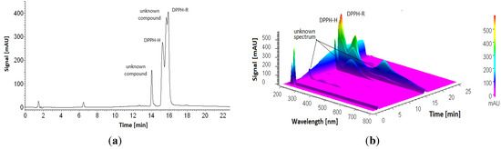 Chromatogram (2D (a) and 3D (b)) of 1 mM DPPH (a) obtained by gradient elution staring from 30% ACN/water with the addition of acetic acid within 20 min (pH = 3.5). The detection wavelength was set at 330 nm.