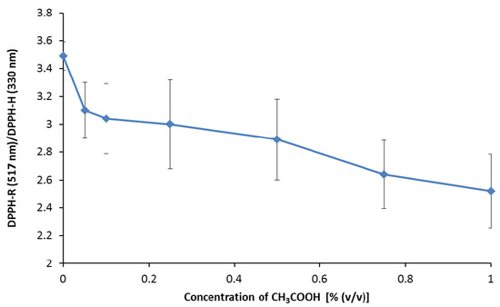 The influence of CH3COOH concentration on the DPPH-R/DPPH-H peak height ratio. Chromatographic conditions: gradient elution from 30% ACN to 60%ACN within 20 min and detection wavelengths of 330 nm (DPPH-H) and 517 nm (DPPH-R). The error bars indicating SD were calculated on the basis of three independent measurements.