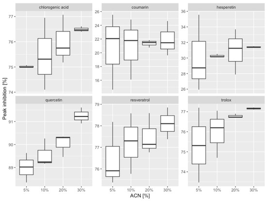 A Welch ANOVA test was conducted for each tested antioxidant. Table 3 shows significant differences in peak inhibition for chlorogenic acid, hesperetin, quercetin, and Trolox (p < 0.05). For these compounds, Games–Howell post hoc tests were conducted. The Games–Howell test is recommended when variance is not homogeneous [34]. Table 4 shows the mean values for selected homogenic groups.