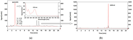 HPLC analysis was carried out by Elite LaChrom HPLC Merck-Hitachi (Merck, Darmstadt, Germany) equipped with a detector array (L-2455), column thermostat Jetstream 2 Plus (Knauer, Berlin, Germany). Chromatographic separation was carried out at 20 °C using a ZORBAX Eclipse XDB-C18, 4.6 × 150 mm, 5 μm column (Agilent Technologies, Munich, Germany). Elution was carried out in linear gradient mode followed by an isocratic step. The mobile phases were composed of water (A) and acetonitrile (B). An increase in % B from 5%, 10%, 20%, and 30% B to 60% B was applied within 10 min; then, 60%B was continued for a subsequent 10 min. The addition of 1% acetic acid (CH3COOH) to A and B ensured a stable pH of 3.5 of the mobile phase in the case of investigation of the acidic environment with respect to DPPH stability. The flow rate of the mobile phase was 1 mL min−1. DAD detection enables chromatogram monitoring in the range of 200 to 800 nm. The injection volume was 20 µL, corresponding to the volume of the Rheodyne injector loop. The column void volume (dead time) was determined to be 1.34 min by injection of an unretained sample of uracil.