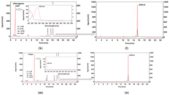 Overlaid spectra and chromatograms of methanolic solutions of standards: quercetin—λ = 370 nm (a), resveratrol—λ = 310 nm (c) hesperetin—λ = 290 nm (e), flavone—λ = 296 nm (g), coumarin—λ = 276 nm (i), chlorogenic acid—λ = 325 nm (k), Trolox—λ = 210 nm (m) before (red) and after reaction with DPPH (black), together with overlaid DPPH-R chromatograms—λ = 517 nm before (red) and after (black) reaction with the appropriate antioxidant: quercetin (b), resveratrol (d), hesperetin (f), flavone (h), coumarin (j), chlorogenic acid (l), and Trolox (n). Antioxidant standards were prepared by mixing 83 µL of a 3 mM solution of the given antioxidant and 417 µL of methanol. Conditions: an increase in acetonitrile from 30% to 60% within 10 min, then 60% ACN for a subsequent 10 min. The peaks of AOs are characterized by the retention time (tr), the retention parameter (k), tailing factor (As), and the theoretical plate number values (N).