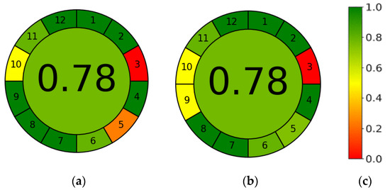 Results of AGREE analysis for UV-vis spectrometry (a) and HPLC-DAD (b). Each of the 12 principles of green chemistry is reflected with a color scale in the 0–1 range (c), while the weight of each principle is related to the width of its corresponding segment.The final assessment result is the color representation in the middle of a clock-like graph.