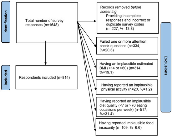 A total of 1648 responses were collected, and due to the exclusion criteria outlined in Figure 1, the final sample size was 814.