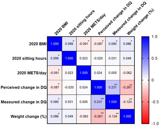 There were no differences in BMI (p = 0.078) between sexes. Significant reductions in BMI were observed in both sexes from the previous year (p = 0.019 for females; p = 0.01 for males). Correlations between outcome variables are reported in Figure 2. BMI in 2020 was positively associated with sitting hours (p = 0.005) and measured change in DQ (p = 0.022), and negatively associated with daily METs (p = 0.010) and perceived change in DQ (p = 0.013). Weight change was positively associated with BMI in 2020 (p = 0.014) and inversely associated with both perceived and measured change in DQ (p < 0.0001 for both). Finally, changes in measured DQ and perceived DQ were positively correlated (p < 0.0001), indicating our DQ Questionnaire was valid.
