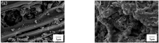 The surface morphology and microstructure of the prepared samples were investigated by SEM. As shown in Figure 1a, the microscopic morphology of BC is a tightly-arranged, banded, porous structure. The SEM image of BC/g-C3N4 is shown in Figure 1b, and the g-C3N4 was evenly distributed on the BC surface. In addition, the roughness and porosity of BC/g-C3N4 were increased, which was due to the g-C3N4 being well stacked on the BC matrix. This was beneficial for increasing the adsorption and photocatalytic efficiency of the material.