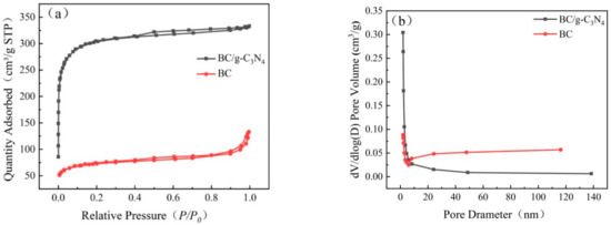 (a) N2 adsorption–desorption isotherms; (b) pore size distribution curves of BC and BC/g-C3N4 (1:3).