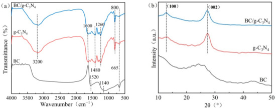 (a) FTIR and (b) XRD of BC, g-C3N4, and BC/g-C3N4 (1:3).