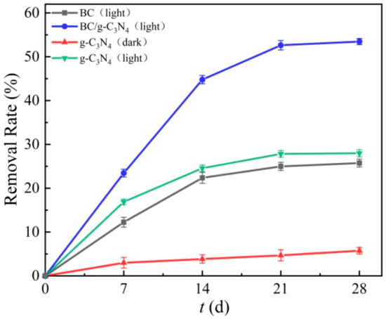 The removal efficiency of TPH in the contaminated soil samples by BC, g-C3N4, and BC/g-C3N4 is shown in Figure 4. The results showed that the BC removed the TPH from the soil mainly by adsorption, and 25.7% of TPH was removed in the 28 d experiment. The TPH removal rate of g-C3N4 was only 5% under dark conditions, whereas the TPH removal rate of g-C3N4 reached 27.9% under light conditions, indicating that g-C3N4 degraded TPH in soil mainly by photocatalysis. It is clearly evident that BC/g-C3N4 showed a higher removal potential than the BC and g-C3N4 (p < 0.05), as 54.5% of TPH was removed in the 28-d experiment, and the removal efficiency of TPH by BC/g-C3N4 was 2.12 times and 1.95 times of the BC and g-C3N4, respectively. This is because the BC/g-C3N4 had a larger specific surface area and a wider energy band, which facilitated the adsorption of TPH on its surface and the separation of electrons and holes, thus greatly improving the TPH removal efficiency of BC/g-C3N4 [39,40].