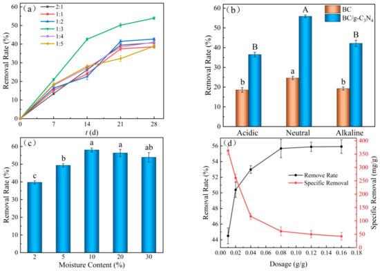 Figure 5a shows the changes in TPH removal efficiency with different doping ratios of BC to g-C3N4. The results show that the TPH removal rate increased from 35% to 54% when the doping ratio changed from 2:1 to 1:3. However, as the g-C3N4 dosage continued to increase, the TPH removal efficiency gradually decreased. This may be due to the initially large amount of g-C3N4 adsorbed on the surface of BC, which increased the surface area of BC and provided more adsorption sites for TPH. At the same time, g-C3N4 played a role in the photocatalytic degradation of TPH in soil, and the removal rate of TPH by BC/g-C3N4 was greatly improved. When the g-C3N4 continued to increase, excessive g-C3N4 accumulated on the BC/g-C3N4 surface and occupied adsorption sites on the BC/g-C3N4 surface, showing competition with the adsorption of TPH. In addition, excessive g-C3N4 agglomerated on the surface of BC, reducing the contact area between the pollutant and the catalyst [41]. This was not conducive to the removal of TPH in the soil by BC/g-C3N4.