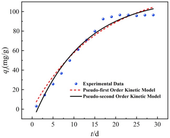 The experimental data were fitted by pseudo-first-order kinetic and pseudo-second-order kinetic [44]. The fitting results are shown in Figure 6 and Table 1.