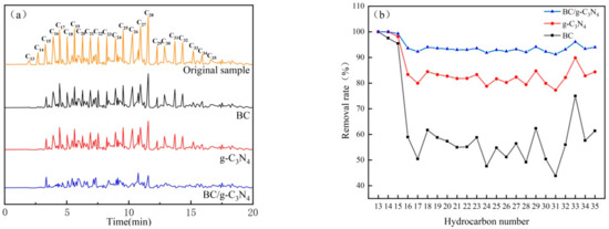 The contents of n-alkanes and PAHs in soil were determined by GC and GC-MS methods. According to the test results, the total concentration of PAHs in the original soil sample was 0.63 mg/kg, and only benzo(g,h,i)perylene, benzo(k)fluoranthene, dibenz(a,h)anthracene, and indeno(1,2,3-cd)pyrene were detected. There were no PAHs that could be detected after the soil samples were treated by BC, g-C3N4 or BC/g-C3N4. Figure 7a shows the GC chromatogram of n-alkanes in soil samples treated by different materials. As observed from the chromatogram of the original soil sample, the n-alkanes were composed of a wide range of hydrocarbons from nC13 to nC35. The relative concentrations of nC17-nC28 were higher than the other n-alkanes, and that of C28 was the highest. The peaks of nC13 and nC14 almost disappeared with the contaminated soil treated by BC, g-C3N4, or BC/g-C3N4. In addition, the peaks of nC29-nC35 also almost disappeared with the contaminated soil treated by BC/g-C3N4. As shown in Figure 7b, the removal rates of nC13-nC15 were above 95% with the contaminated soil treated by BC or g-C3N4. The removal rates of nC16-nC35 were around 50% for BC treatment, which reached around 80% for g-C3N4 treatment. When BC/g-C3N4 was used to remove n-alkanes from soils, the nC13-nC15 were completely removed, and the removal rates of the nC16-nC35 increased to more than 90%. The BC/g-C3N4 synergistically worked to improve the removal of petroleum hydrocarbons from the soil significantly, which was consistent with the previous results shown in Figure 4.