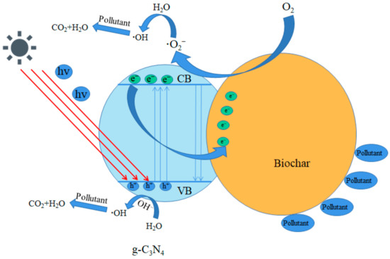 Figure 8 shows the adsorption and photocatalytic mechanism of BC/g-C3N4. The g-C3N4 could generate electron–hole pairs under visible light. Under irradiation, electrons were excited from the valence band (VB) of g-C3N4 to its conduction band (CB), leaving a positively-charged hole (h+) in the VB of g-C3N4. The disadvantage of the pure g-C3N4 photocatalytic material was that the photo-generated electrons and holes rapidly combined to fail, which affected its photocatalytic efficiency [47]. As a conductive channel, BC enhanced the electron transfer rate of g-C3N4 and provided more active sites for photocatalysis [48]. In addition, BC played the role of electron traps, and the photo-generated electrons of g-C3N4 could be transferred to BC for temporary storage, which was conducive to the separation of electron–hole pairs, so that more electrons were involved in the photocatalytic process and the photocatalytic efficiency was improved [49]. The rich pore structure and large specific surface area of BC could enrich TPH in soil, and had a synergistic effect with the photocatalytic process of g-C3N4.
