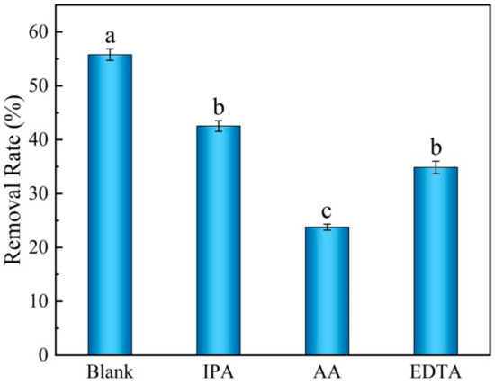 The electrons in g-C3N4 and the electrons accumulated on BC combined with O2 to form superoxide radical (·O2−), whereas the remaining holes in the VB combined with H2O to form hydroxyl radical (·OH). The removal of petroleum hydrocarbons from the soil is carried out by the strong oxidizing properties of these groups. In order to understand the degradation mechanism in depth, the active radicals were identified by free radical capture experiments. Isopropanol (IPA), ascorbic acid (AA), and ethylene diamine tetraacetic acid (EDTA) were employed as the hydroxyl radical (·OH), superoxide radical (·O2−), and hole (h+) scavengers. As Figure 9 shows, the removal rates of TPH decreased when the scavengers were added, indicating that ·OH, ·O2−, and h+ were involved in the photocatalytic degradation of TPH. In particular, the removal rate of TPH greatly decreased from 55.94 to 24.87% after the addition of AA, indicating that ·O2− was the main active radical in the photocatalytic process.