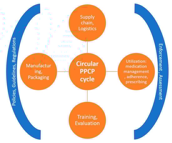A core principle of a circular economy is that the value of products and the materials they are made of can be preserved by keeping them in the economic system, either by lengthening the life of the products formed from them or by “looping” them back into the system to be reused [68]. The global healthcare sector is growing rapidly due to aging populations. During COVID-19, single-use and disposable personal protective equipment contributed to solid waste. Yet, the implementation of CE in healthcare and specifically in PPCPs is challenging. There is an inherent contradiction since, in the medical field, the use of disposable syringes, gloves, etc. has led to a reduction in infections and, subsequently, an improvement in human health and mortality. Therefore, it may not be possible to entirely eliminate single-use or disposable items in healthcare, nor pharmaceuticals, however, solutions to improve material deterioration and reduce their persistence in the environment are under consideration by various regulators.