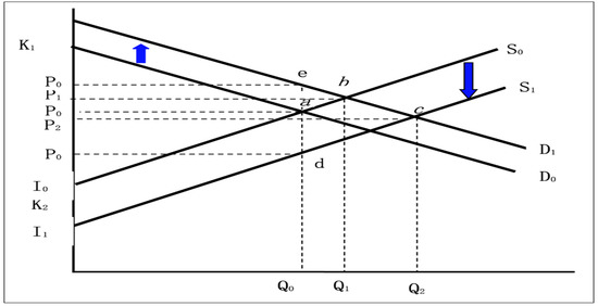 S0 denotes the supply function of the kiwifruit market before the application of honeybee pollination technology, and D0 denotes the demand function. The initial prices and quantities are P0 and Q0, respectively. The application of honeybee pollination technology has improved the quality of kiwifruit products and has increased the demand for these products. As shown in Figure 2, the demand curve moves upward to D1, the market equilibrium point moves from a to b, the curve moves by , the demand increases to Q1, and the price rises to P1. The reduction in unit production cost is (or the translation of the increase in unit output). According to Figure 2, the supply curve moves down to S1 in parallel, the market equilibrium point moves from b to c, the demand increases to Q2, and the price rises to P2.