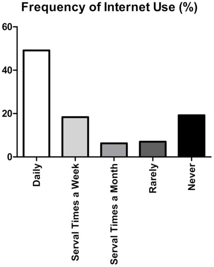 Frequency of Internet use. Descriptive bar chart showing the frequency of Internet use in our cohort. Most of the participants (<65%) reported frequent Internet usage. Nonetheless, 19.24% (n = 132) of the participants never use the Internet.