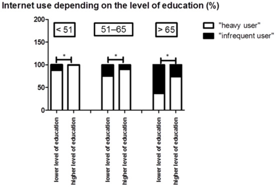 Internet use depending on the level of education. Younger patients and patients with a higher level of education more frequently used the Internet (p = 0.05). Abbreviations: * p < 0.05.