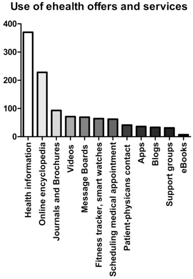 Additionally, we could demonstrate that the use of eHealth services is significantly higher in female participants, while age or education did not influence the use of eHealth services. Our findings are in accordance with previous literature that indicates that women are more likely than men to play an active role in obtaining information and to seek information from as many different sources as possible [43,44].