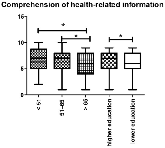 Comprehension of health-related information: We noticed a decreasing arithmetic mean value with increasing age of the participants. Additionally, the ability to comprehend health-related information was statistically significant in patients with higher levels of education. Abbreviations: * p < 0.05.
