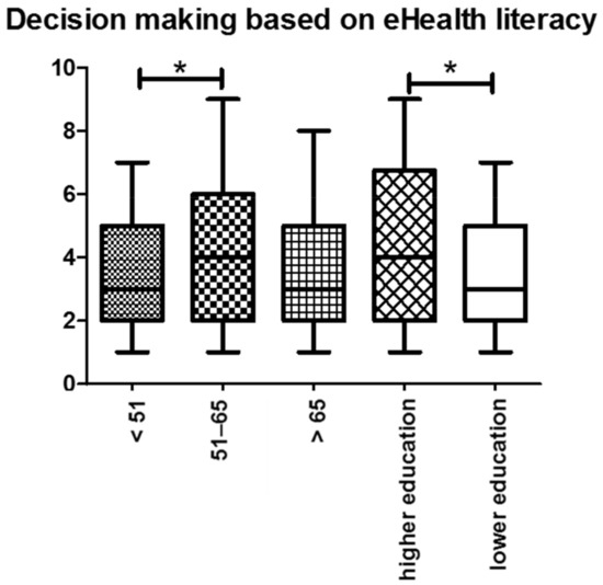 Decision making based on eHealth literacy: In general, older participants were more certain when making a decision based on health-related information from the Internet. Similarly, participants with higher education levels were more certain in their decision-making process. Abbreviations: * p < 0.05.
