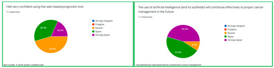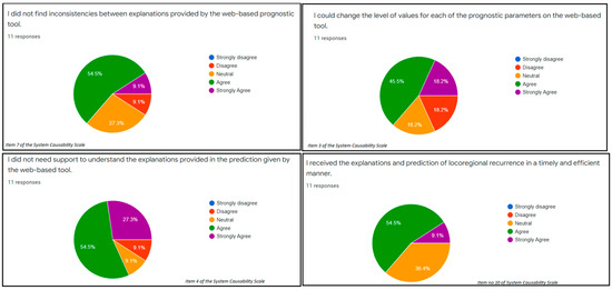 For fidelity components, 9.1% strongly agreed while 54.5% agreed about the soundness of the model (Figure 4: item 7 of the SCS). Similarly, 18.2% strongly agreed while 45.4% agreed about the completeness of the web-based prognostic tool (Figure 4: item 3 of the SCS). For the interpretability components, 27.3% strongly agreed about parsimony of the web-based prognostic tool while 54.5% agreed about the parsimony of the tool (Figure 4: item 4 of the SCS). Additionally, 9.1% strongly agreed while 54.5% agreed on the clarity of the examined web-based prognostic tool (Figure 4: item 10 of the SCS).