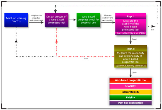 A framework that considers the post hoc explanations of a web-based prognostic tool is presented in Figure 5. The framework considers all the essential components of post hoc explainability. The framework emphasized that the essential components (items 4 and 10) of the SUS should be properly considered after the developed machine-learning model is integrated as a web-based prognostic tool. Similarly, the score of the SCS ranged between 0–1. Therefore, less than 0.5 indicates a need to significantly modify the design of the web-based tool (Figure 1).