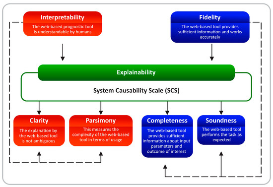 The core components of interpretability include clarity and parsimony while the essential components of fidelity encompass completeness and soundness. For interpretability of the web-based tool, clarity means that the explanations offered by this model are not ambiguous [14,27]. Similarly, the parsimony component of interpretability measures the complexity of the web-based tool in terms of the usage [14,27] (Figure 6). Regarding fidelity, completeness means that the web-based tool provides sufficient information about the inputs and the output. However, soundness as an essential component of fidelity ensures that the web-based tool performs the task as expected [26] (Figure 6). While it has been argued that measuring both interpretability and fidelity at the same time could be challenging [14], the SCS proposed by Holzinger et al. offers some important items that can address some of the essential components of interpretability and fidelity needed to achieve an explainable web-based tool that offers post hoc explanation [12]. Specifically, items number 3, 4, 7 and 10 of the SCS arguably discussed completeness, parsimony, clarity, and soundness of a typical AI-based web tool for cancer prognostication (Table 2).