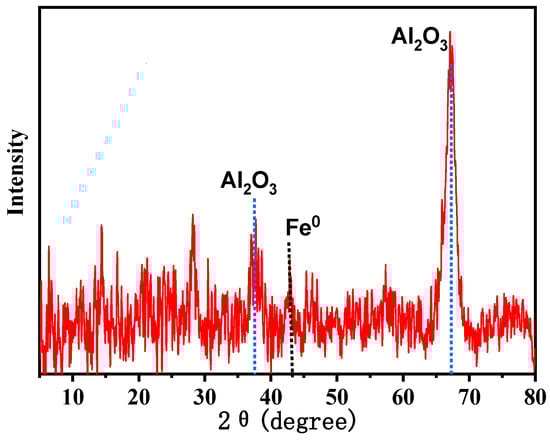 Morphologies of the Al2O3 microspheres and ZVI-ALOX are shown in Figure 1. The internal structure of the Al2O3 microspheres was porous and rough, which was beneficial for sequestering the ZVI (Figure 1a). The ZVI particles were spherical or near-spherical in shape (80–100 nm), and located in the pores or channels of the microspheres (Figure 1b). The elemental composition and calculated mass ratio of Fe (5.92 wt%) obtained by EDS indicated that ZVI was successfully incorporated within the Al2O3 microspheres. At the same time, diffraction peaks corresponding to Al2O3 and the ZVI were observed in the XRD spectra of ZVI-ALOX (Figure 2).
