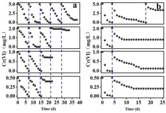 The sequential batch experiments comparing the removal efficiencies of Cr(VI) using ZVI-ALOX and ZVI over the initial concentration range 0.5–5.0 mg/L are shown in Figure 3. Notably, ZVI-ALOX maintained better continuous Cr(VI) removal performance compared with ZVI: at 5.0 mg/L Cr(VI) solution, the removal efficiency of ZVI-ALOX was 100% after 7 d, and this performance was maintained for further three cycles (i.e., a total of 28 d). In comparison, the first cycle with ZVI at 5.0 mg/L Cr(VI) achieved 100% removal in 4 d, the second cycle required 14 d to achieve 100% removal, and removal ability decreased greatly thereafter. Similar trends were observed at lower initial concentrations of Cr(VI). Compared with ZVI, which was in direct contact with the Cr(VI) solution, the Al2O3 microspheres may increase the mass transfer resistance of Cr(VI), thereby delaying its contact with the sequestered ZVI. Hence, the initial removal of Cr(VI) by ZVI was relatively rapid. However, subsequent oxidation when exposed to air or water rapidly reduced its efficiency (Figure 3b). On the other hand, the Al2O3 matrix surrounding ZVI may reduce contact with the non-target substrates such as dissolve oxygen (DO) and water, enabling optimum removal performance over a greater time period.