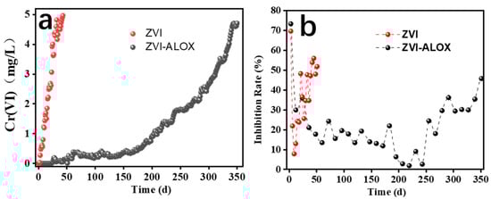 Long term removal experiments using ZVI and ZVI-ALOX (influent [Cr(VI)], 5 mg/L): (a) effluent concentrations of Cr(VI); (b) inhibition rates of P. phosphoreum in the column effluents.