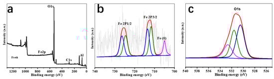 XPS spectra of ZVI-ALOX before the Cr(VI) removal reaction: (a) wide scan survey spectrum; (b,c) high resolution spectra of Fe 2p and O1s.