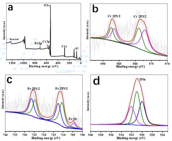 XPS spectra of ZVI-ALOX after the Cr(VI) removal reaction: (a) wide scan survey spectrum; (b–d), high resolution spectra of Cr 2p, Fe 2p and O1s.