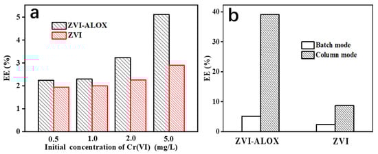 EE is a quantitative measure of electron utilization during the ZVI target reduction process, which provides a basis to improve economic efficiency. The physical structures of ZVI, initial concentration of the target solution, mode of reaction and the substrate system all affected EE values (Figure 7). Figure 7a shows that the EE of ZVI-ALOX and ZVI both increased with increasing initial Cr(VI) concentration. Compared with ZVI, the values of EE obtained with ZVI-ALOX were higher at all concentrations, especially at 5 mg/L Cr(VI). This suggested that the interface between Al2O3 and ZVI in the microspheres played an important role in the utilization of ZVI. Both ZVI-ALOX and ZVI gave higher EE values in the column removal mode. Obviously, compared with the batch removal of Cr (VI), the EE values of isolated ZVI were significantly higher (39.1% vs. 5.12%) (Figure 7b).
