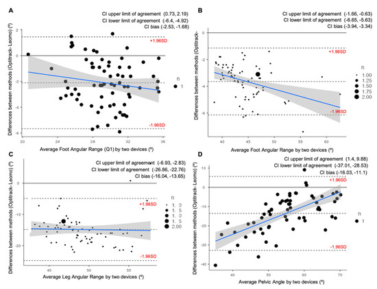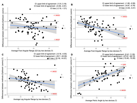 Bland–Altman plots representing comparisons between the Optitrack system and the Leomo system for four of the variables analyzed at VT1: (A) Average Foot Angular Range at first quartile of the pedaling cycle (Q1); (B) Average Foot Angular Range; (C) Average Leg Angular Range; (D) Average Pelvic Angle. The mean line represents the mean difference between the devices, with the upper and lower dashed lines representing the 95% limits of agreement (LOAs). 95% confidence intervals (CI) of the upper LOAs, lower LOAs, and bias are shown in the legend of each figure.