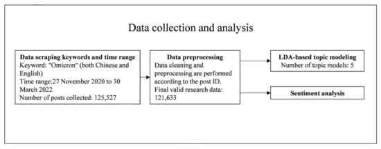 In this study, Sina Weibo was selected as the data collection object. Sina Weibo, China’s leading social media user platform, allows users to send and receive posts with short character limits and retrieve text content by searching for specified keywords within a defined date range [17]. Although the B.1.1.529 variant was detected on 9 November 2021, the public debate was sparked only after the World Health Organization named the variant. Therefore, this study started at the time when the omicron variant was first publicly discussed on Weibo (0:00 27 November 2021). On 31 March 2022, we noticed that the discussion of the new variant appeared on Weibo, and the discussion of the omicron variant decreased; omicron variants can be divided into many subvariants (e.g., BA.1, BA.1.1, and BA.2). However, on social media, people usually do not discuss individual subvariants but use the common term “omicron” to describe them. Therefore, Python programming language scripts and Weibo open Application Programming Interface (API) were used to search for the keyword “omicron” (both Chinese and English). The data crawling time range was from 0:00 on 27 November 2020 to 23:59:59 on 30 March 2022 (Beijing time), and a total of 125,527 Weibo posts about omicron were collected. It is worth noting that the start time for the data acquisition for this article was 27 November 2020 and that data from before this time are not within the scope of this study. To avoid repeated data, we cleaned the data according to Weibo ID and finally obtained 121,633 posts as valid data for this study. For each Weibo post, we collected and downloaded the following features: (1) the full text, (2) the post time, (3) the post ID and (4) the users’ description/self-created profile. Figure 1 shows the overall research design framework of this study.