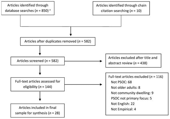 Charting involves synthesizing and interpreting data based on key items of information from the studies reviewed []. Data were extracted from selected articles based on general study characteristics (author(s), year of publication, journal, aim/goal/purpose, research design, sample characteristics, and statistical or analytical approach) and on specific PSOC topics, such as hypotheses, conceptualization of PSOC, type of variable PSOC was in analysis, constructs or variables tested with PSOC, and main results. Data were also charted on how articles fit into research themes and their relevance to the Ecological Theory of Aging or AFC.
