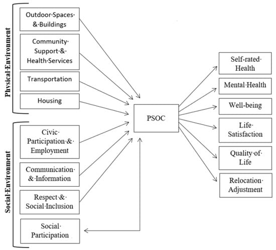The emergence of AFC demonstrates a shift in research and practice from focusing on the individual level to the community level []. Thus, older adults’ perceptions of their communities become an essential focus for research. A primary goal of the AFC framework is to design communities and environments that meet the needs of older adults, and as Nowell and Boyd [] point out, PSOC is produced when the community can meet residents’ needs. While PSOC is not part of the AFC framework, it is an important construct for understanding how environmental influences and community-level factors affect health and well-being outcomes. In fact, PSOC acts as a mediator to link age-friendly environment features with life satisfaction [], subjective well-being [], and self-rated health [].