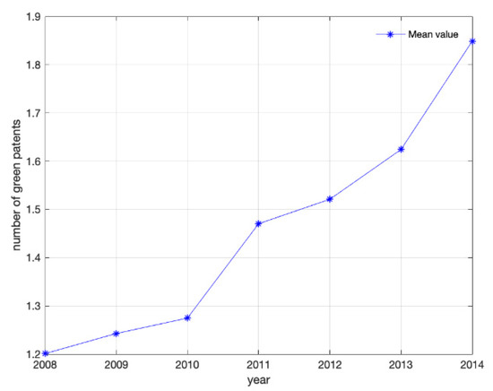 Furthermore, Figure 1 plots the mean of green invention of listed Chinese firms from 2008 to 2014. It shows that green innovation grew from 1.2011 in 2008 to 1.8488 in 2014, which reflects that firms are paying considerable attention to green development. During this period, the Chinese government also promulgated a series of policy measures to promote green growth. For example, in the 12th Five-Year Plan of 2011, it was proposed to focus on energy conservation and emission reduction to promote green and low-carbon development.
