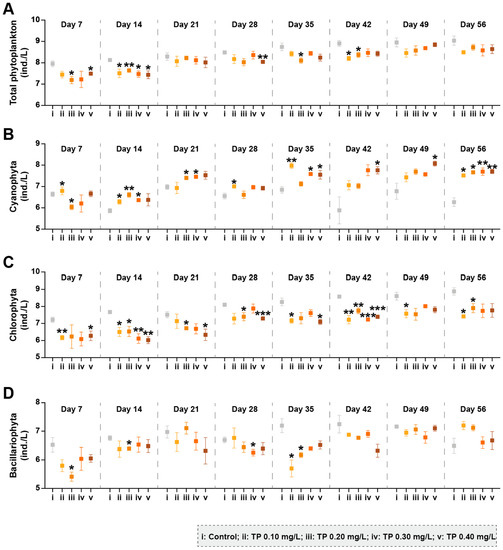 Figure 2 shows the changes in phytoplankton community diversity during the exposure period. Compared with control groups, the Shannon–Weaver diversity indices (H) and Margalef richness indices (M) were consistently declined in TP ≥ 0.1 mg/L treatments. The eutrophic metric Algae Group Index (AGI), which is one of the indicators raised in the Water Framework Directive (WFD) [42], was also calculated (Table S1). The AGI close to 1 indicates the good status of the aquatic ecosystem [46]. In our study, the addition of TP disrupted the health of the water body. Compared to controls, the AGI were increased 80.66%, 58.03%, 80.79%, and 116.88% in TP 0.10 mg/L, TP 0.20 mg/L, TP 0.30 mg/L, and TP 0.40 mg/L, respectively.