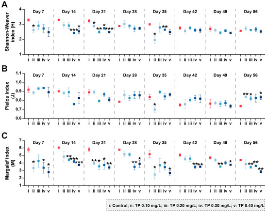 Shannon–Weaver diversity (A), Pielou evenness (B), and Margalef richness (C) of zooplankton communities under different TP concentrations. Significant differences are indicated in the figure, p ≤ 0.05 is marked as *, p ≤ 0.01 is marked as **, and p ≤ 0.001 is marked as ***.
