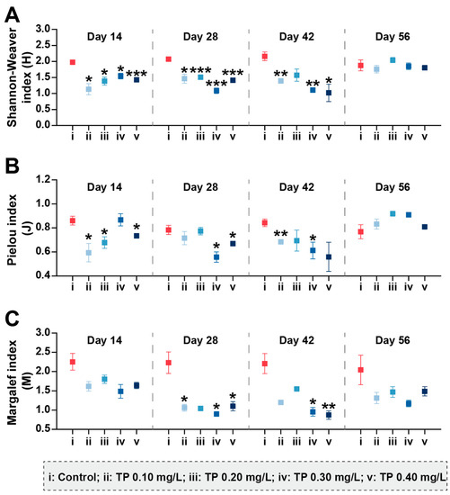 The community diversity indices were sensitive to TP concentrations and showed downward trends (p ≤ 0.05) (Figure 5). During the exposure period from 0 to 42 days, Shannon–Weaver diversity (H) in 0.10, 0.20, 0.30, and 0.40 mg/L treatments were 35.73%, 28.09%, 39.83%, and 37.79%, respectively, lower than that in the control groups. The results for Pielou evenness (J) showed roughly the same trend. Margalef richness (M) in 0.10, 0.20, 0.30, and 0.40 mg/L treatments were strongly inhibited by 40.56%, 32.90%, 48.40%, and 41.64%, respectively, during the entire period of exposure.