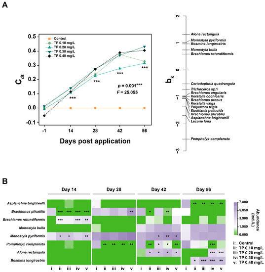 The PRC is significant (p = 0.001) and 28.44% of the total variance in the zooplankton dataset is explained by treatment and 52.54% by the factor time (Figure 6A and Table S2). Statistically significant (p ≤ 0.001) differences in zooplankton species composition between controls and TP enrichment treatments during the entire period of exposure. At the species-level, there was a generally significant increasing trend in the abundances of Monostyla pyriformis and Alona rectangular in TP enrichment treatments. In contrast, the abundance of Pompholyx complanate showed a significant downward trend (Figure 6B).