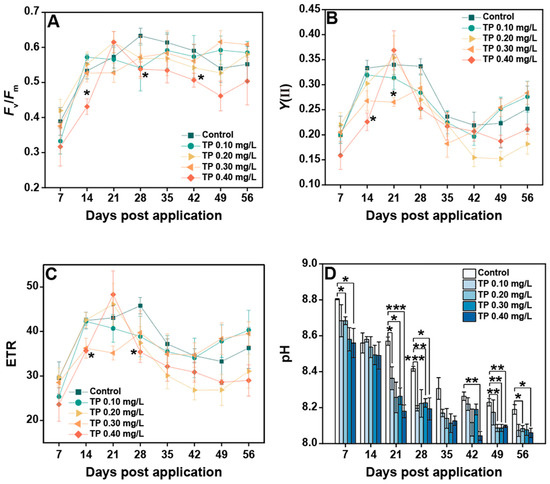 The responses of chlorophyll fluorescence parameters to TP are shown in Figure 7A–C. When TP concentration was up to 0.40 mg/L, Fv/Fm was 11.69%, generally lower than that in the control groups. Y(II) in 0.10, 0.20, 0.30, and 0.40 mg/L treatments were declined 3.41%, 15.27%, 6.84%, and 14.33%, respectively. The experimental results for ETR showed roughly the same trend. The consistently significant effects (p ≤ 0.05) of TP on chlorophyll fluorescence parameters mainly occurred in the TP 0.4 mg/L group. The pH showed a decreasing trend with increasing TP concentration, with a maximum reduction of 2.36% in the TP 0.4 mg/L group (Figure 7D).