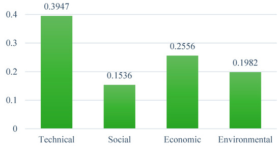 Figure 6. The results indicate that the most significant criteria to influence the implementation of WtE technologies in Ghana are the technical criteria, with the highest weight of 0.395. This is followed by economic, environmental, and social criteria, with priority weights of 0.256, 0.198, and 0.154, respectively. These findings imply that WtE development in Ghana should prioritize assessing whether the selected technology is mature and reliable, as well as whether electricity generation and waste conversion are efficient enough. In order to achieve the goal of increasing the share of renewable energy in Ghana’s overall energy mix while efficiently treating MSW, it is vital to assess the feasibility of all of the technical factors. Cost is the next most important consideration for decision-makers when selecting a WtE technology. As a developing country with relatively lower economic growth, financial problems could be a crucial hindrance to WtE development in Ghana; therefore, selecting a cost-effective technology is considered very vital in achieving the main goal. Furthermore, the cost and technology are closely related, such that the cost reduces as the WtE technology improves. Because of the development in environmental consciousness in recent years, the environmental criterion is also becoming increasingly relevant. Unsurprisingly, this was reflected in the experts’ judgement, as MSW in Ghana is characterized by conventional and inefficient treatment methods that pose a serious threat to the environment and public health. Apart from the main benefits of energy generation and waste management, a WtE technology must be capable of reducing environmental impacts such as GHG emissions, soil, water and air pollution, and their related health impacts. The social aspect is generally the last thing to consider in WtE development in Ghana. The results of previous investigations on selecting sustainable energy sources and waste management strategies using either AHP subjective weights or other weighting methods are similar to the priority ranking of the main criteria established in this study [