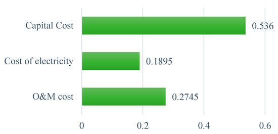 Figure 8 that the capital cost carries the highest importance in the selection of a WtE technology in Ghana, with an obtained weight of 0.536 and a large margin between this sub-criterion and the next significant sub-criterion. O&M cost is the next important sub-criterion, with a weight of 0.275, followed by the cost of electricity, with a weight of 0.189. Based on the experts’ judgements, the initial investment cost involved in the complete construction of a WtE facility in Ghana is more relevant than the technology’s O&M costs and the cost-per-unit generation of electricity. A similar observation was reported by previous studies in which the capital cost of WtE technologies gained the highest priority in decision-making concerning economic criteria [