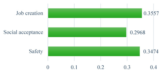 Figure 10 reveal that job creation is the most important sub-criterion to consider when selecting an optimal WtE technology for implementation in Ghana, with a priority weight of 0.358. The next important criterion in this context is safety, with a weight of 0.347, while the least important is societal acceptance, with a weight of 0.297. Because of the high unemployment rate in Ghana, greater focus is placed on the creation of new job possibilities among the social criteria. The relatively small gap between job creation and the safety criterion also indicates that the dangers and risks associated with constructing and operating a WtE facility are given almost equal attention when considering an optimal WtE technology selection in Ghana.