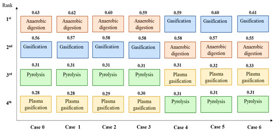 It can be seen that the ranking order from the first to the third scenario was maintained even though the values changed slightly. Anaerobic digestion still ranked as the optimal WtE alternative even after the weights of the three technical criteria were increased by 5%, 10%, and 15%. The remaining alternatives also maintained their ranking orders after the first three scenarios, with gasification as the second most feasible technology, followed by pyrolysis and plasma gasification. This indicates a high level of robustness and consistency in the initial rankings. However, after the initial weights were increased by 20%, 25%, and 30% in scenarios 4 to 6, the ranking order of all of the WtE alternatives changed alongside the values. Gasification became the first technology, followed by anaerobic digestion, plasma gasification, and pyrolysis, which ranked as the least preferred technology. This could be attributed to the fact that more emphasis was placed on the technical criteria, which carry the highest weight among all of the evaluation criteria. Therefore, the results favour gasification and plasma gasification, as they performed best in the two most important technical criteria, i.e., power generation capacity and conversion efficiency. This implies that when decision-makers and stakeholders focus on the ultimate goal of selecting a technology that can adequately generate electricity for Ghana while ignoring other factors, gasification would be the best alternative, followed by plasma gasification. The energy conversion process of anaerobic digestion, on the other hand, is not as efficient as the thermochemical processes; therefore, if more priority is given to the technical factors, this alternative will be less favoured for selection in Ghana.
