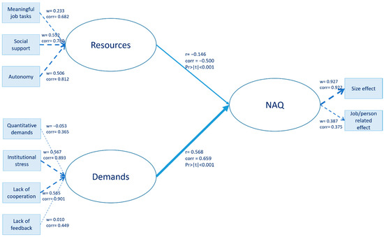 Our model specification (Figure 1) aimed at testing the hypotheses described in the JD-R theory section. The measurement model related the factors obtained from factor analysis in the following way: (i) the manifest variables “meaningful job tasks”, “social support”, and “autonomy” were related to their own latent variable “Resources”; (ii) the manifest variables “quantitative demands”, “institutional stress”, “lack of cooperation”, and “lack of feedback” were related to “Demands”; and (iii) the two “negative act factors” were related to the latent concept “NAQ”. For the measurement model, the manifest variables for “Resources” and “Demands” were related to their own latent variable in a formative way. The latent concept “NAQ” was created in a formative way; thus, the block of manifest variables can be multidimensional (as they were constructed by principal component analysis). The assessment of formative measurement models involves the test for potential multicollinearity between items (variance inflation factors values below a threshold) and the analysis of weights, which provide information about how each item contributes to the construct measurement. The structural model related the endogenous latent variables “Resources” and “Demands” to the dependent latent variable “NAQ” through direct effects. This followed the JD-R model in the assumption that high job demands and low levels of resources increase bullying.
