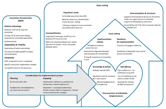 Studies show poor achievement of guideline-recommended CVD prevention targets [34,35], as the translation of evidence-based interventions to practice remains limited. Moreover, little is known about how context (Definition: context reflects a set of characteristics and circumstances that consist of active and unique factors that interact, influence, modify, and facilitate or constrain the intervention and its implementation) can influence their implementation [36,37]. As such, there is an urgent need to investigate the factors that could facilitate or hinder the implementation process in specific primary care and community settings; and with our study, we provide an approach transferable to other contexts. These insights will allow us to further contextualize and plan the implementation process of targeted interventions and strategies for detection and management of CVD risk factors in the general population as well as in vulnerable subpopulations. In addition, we provide recommendations for planning successful and sustainable implementation.