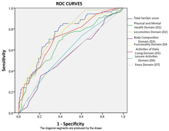 Additionally, the area under the curve obtained by Geerinck et al. [54] for the total score of the SarQoL questionnaire was higher (0.771) than the score obtained by the researchers of this study when the same conditions were applied to the group with the disease (Table 5) or including the cases of probable sarcopenia (0.756).